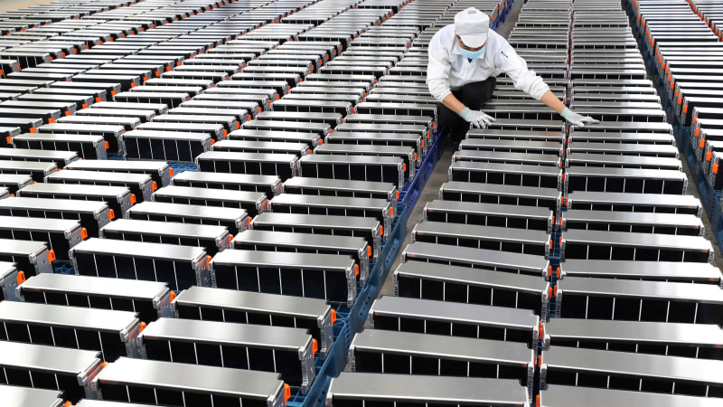 A worker with lithium EV batteries at a factory for Xinwangda Electric Vehicle Battery Co., in Nanjing, China, in 2021. (AFP via Getty Images)